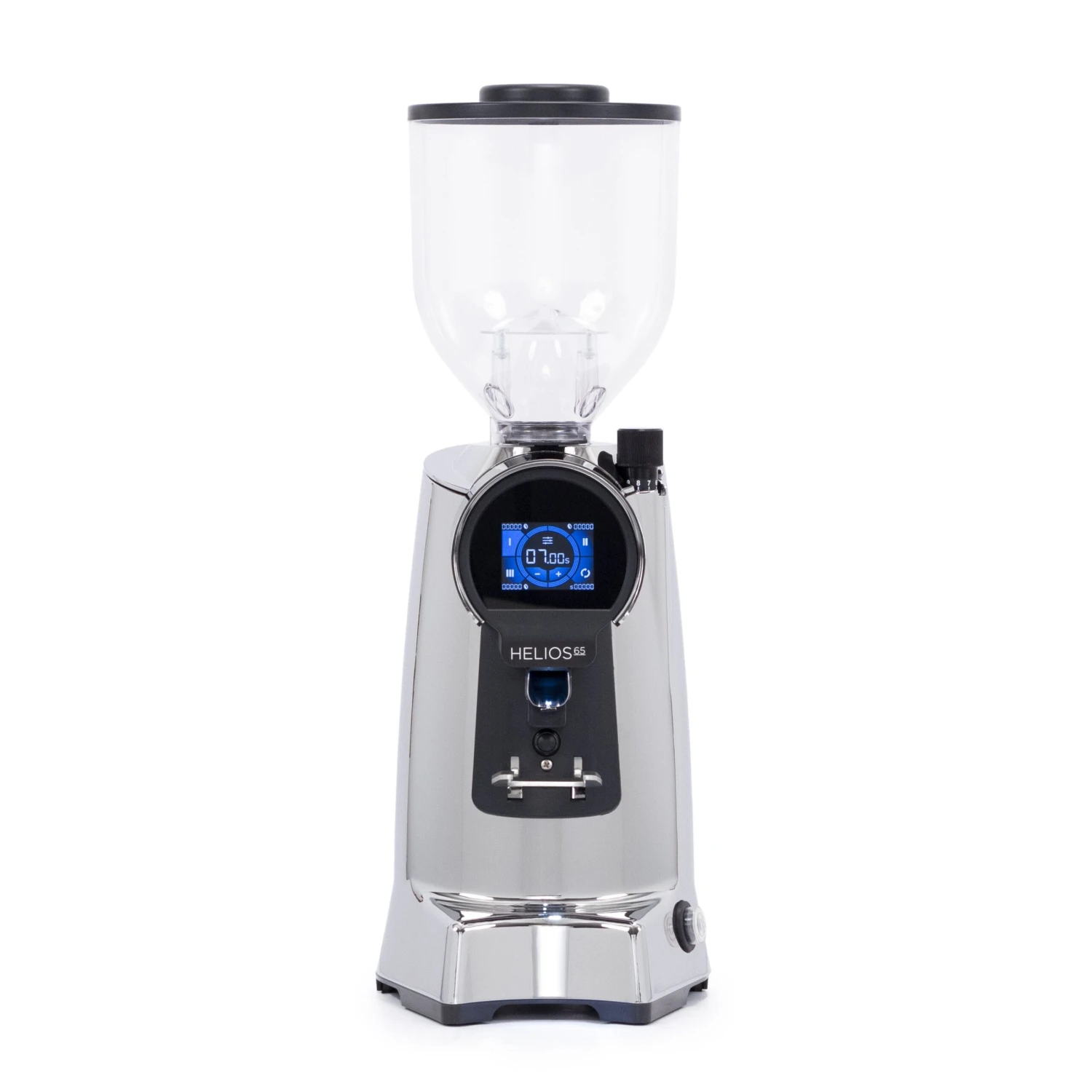The Eureka Helios 65 is a high speed espresso grinder with intuitive touchscreen controls, 65mm flat burrs, and stepless micrometric grind adjustment. The touchscreen display stores 3 timed-grinding presets, a manual grinding option, and more.