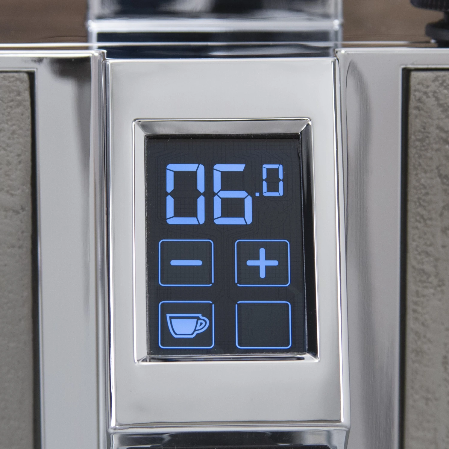 Two doses are available, as well as continuous manual grinding. Selections and adjustments are made using the light-up touchscreen display which makes managing your settings quick and natural. For convenience, the portafilter fork is adjustable and allows for hands-free operation.