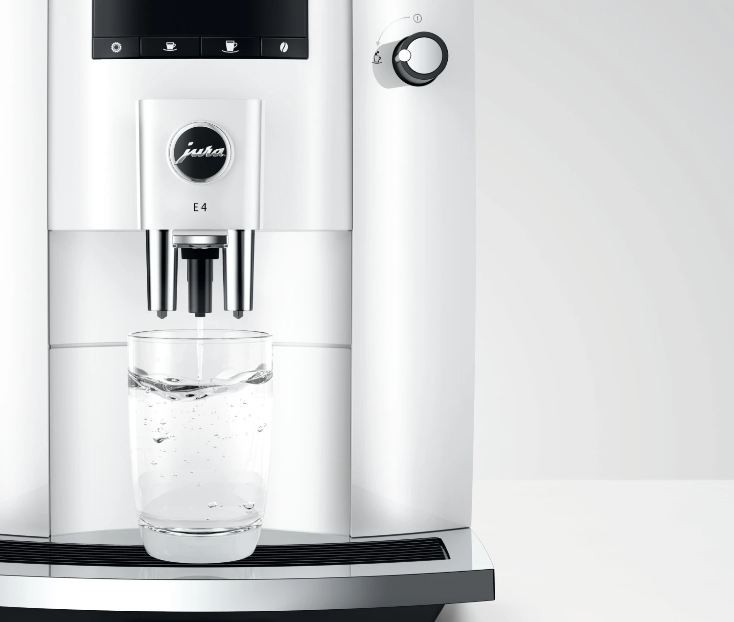 Brew your perfect cup of coffee or shot of espresso with just the touch of a button with the JURA E4. This super-automatic espresso machine comes with a built-in Professional Aroma Grinder, an eighth generation brewing unit, and a minimalist design that will let it fit into any coffee setup seamlessly. Whether you want to brew a double shot of espresso or just get hot water to use for tea, the E4 is here to make things easy.