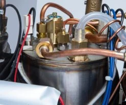 The 1.6-liter stainless steel boiler on the Pro 400Â With Flow Control is made of stainless steel, which allows for a durable heating element that will evenly heat up for your morning brew. The heat exchanger boiler can brew and steam at the same time, and you can also quickly and easily dispense hot water through the separate hot water wand.